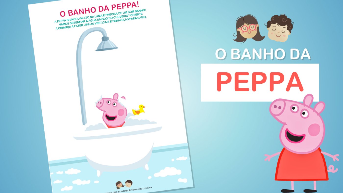 Mais uma atividade para trabalhar de forma lúdica a fase pré escrita! Vamos dar banho na peppa? Mas peraí… não está saindo água do chuveiro! Vamos desenhar risquinhos verticais então, para ela ficar bem limpinha! Dessa vez fiz duas opções, uma sem pistas, e outra com um pista visual. Além disso, fiz também outras opções, caso seu pequeno não curta tanto a peppa. Então tem banho no rubble, na skye, na ryder… kkkkk