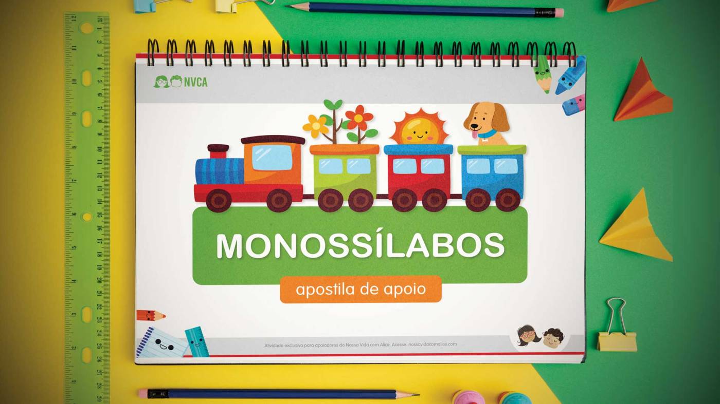 Caros apoiadores e apoiadoras! O arquivo de hoje é uma apostila de 10 páginas, com atividades para serem feitas em conjunto e como apoio ao vídeo de compilação especial MONOSSÍLABOS, do canal NOSSA VIDA COM ALICE. 😀