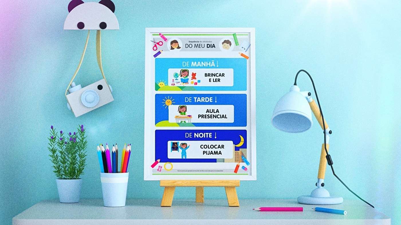 O arquivo que trago hoje, é um cartaz que visa trabalhar os conceitos de manhã, tarde e noite, ou seja: os períodos do dia. Esse material foi idealizado, pois minha pequena não estava querendo ir para a escola, e eu precisei criar algo que explicasse de maneira respeitosa que no período da tarde ela deveria ir para a aula. Os conceitos de turnos são trabalhados através de ilustrações, que simbolizam o sol nascendo, o sol da tarde e a lua. A ideia é aproveitarmos as cartelas já criadas para o quadro de rotina, e montar uma sequência de eventos. No meu caso, eu usei as imagens abaixo. Mas fique à vontade para escolher as que fizerem mais sentido para você e seu filho, aluno ou paciente. Em seguida, finalizei com uma folha plastificada e velcro para fixar as cartelas. Para finalizar, fixei em um display, para deixar o material em pé, facilitando a visualização.